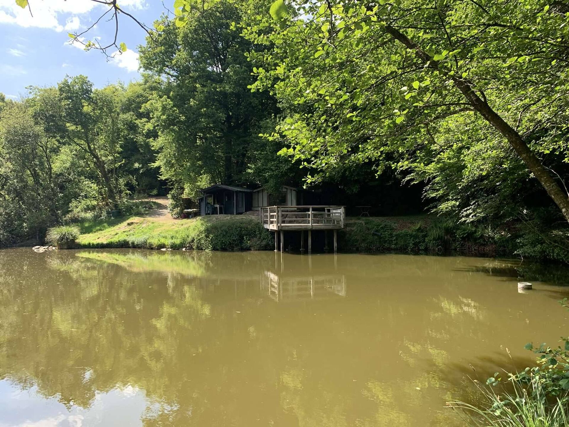 - Une cabane de chasse construite en bois en bordure d’un étang et avec une terrasse en bois. Alimentation en eau par réserve d’eau et électricité par un groupe électrogène